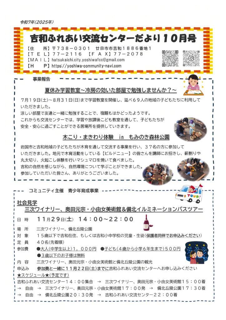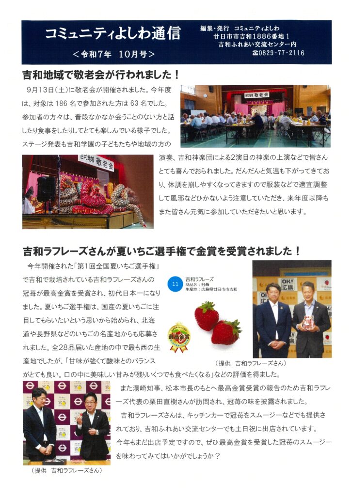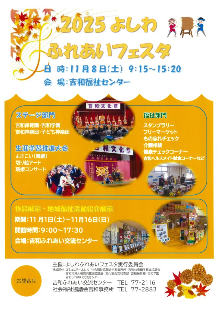 11月8日(土)に2025よしわふれあいフェスタが開催されます。当日は吉和福祉センターにて、吉和学園や吉和保育園などの地域の子どもたちの発表やよさこい(舞踊… -