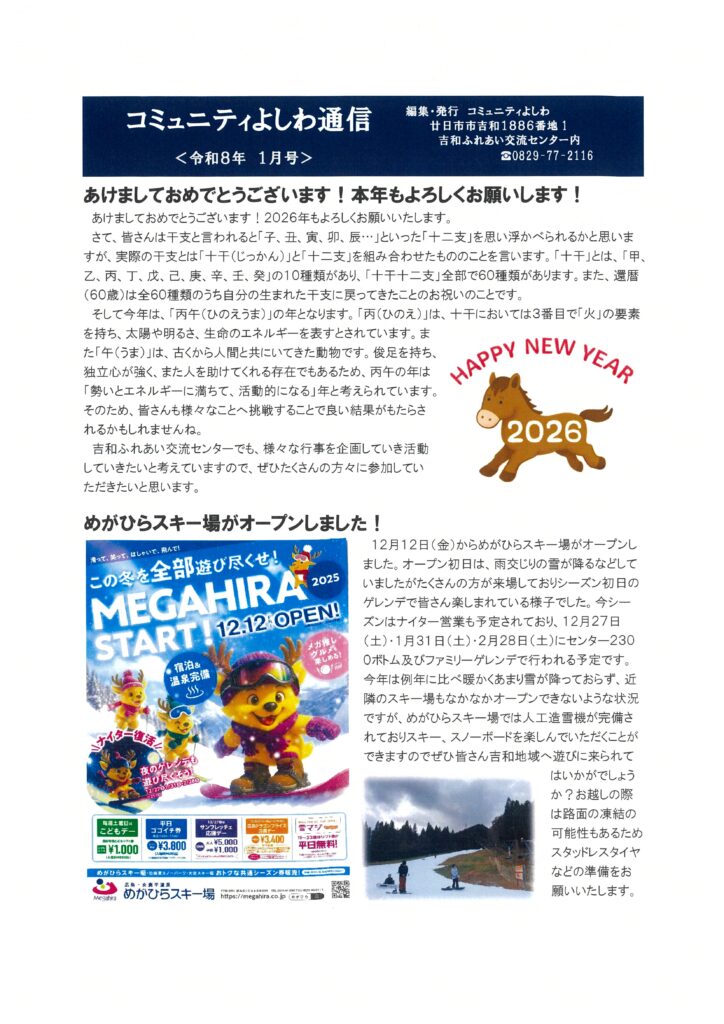 新年あけましておめでとうございます。旧年中は、吉和ふれあい交流センターのご利用や事業にご参加いただき、誠にありがとうございました。本年も昨年に引き続き、皆様… -