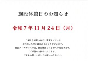 11月24日(月)は施設メンテナンスの為休館日とさせていただきます。日頃より吉和ふれあい交流センターをご利用いただきありがとうございます。ご不便をお掛けいたします。ご了承の程よろしくお願いいたします。 お知らせ この記事が気に入ったら フォローしてね! Follow Me よかったらシェアしてね! URLをコピーしました! URLをコピーしました! よしわふれあいフェスタ開催されました(^^♪ 関連記事 よしわふれあいフェスタ開催されました(^^♪ 2025年11月13日 吉和ウォーキングが開催されました! 2025年11月5日 さつまいも親子クッキング! 2025年10月29日 よしわふれあいフェスタが開催されます! 2025年10月17日 吉和秋のウォーキングが開催されます! 2025年10月2日 吉和ラフレーズさんの冠苺が金賞を受賞されました! 2025年10月2日 地域住民の方々とカープ観戦に行きました!(主催事業) 2025年9月12日 吉和夏まつり花火の打ち上げが行われました! 2025年8月23日