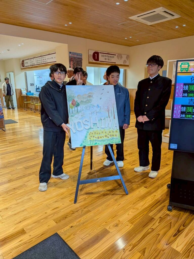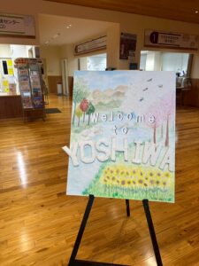 吉和学園9年生の皆さんがキャンパスに吉和の四季を描いた手作りウェルカムボートを作ってくださいました。段ボールを活用し立体的なYOSHIWAの文字やスキーゲレンデなどを表現しています。その他にも水彩画で描かれた夏のひまわり、秋の紅葉、春のさくらが一枚のキャンパスに描かれてます。どうぞご来館ください。